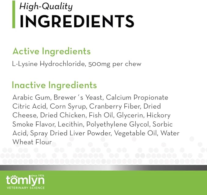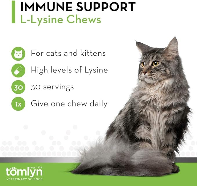 - Tomlyn vet-quality Lysine chews provide immune support for respiratory issues for as long as needed