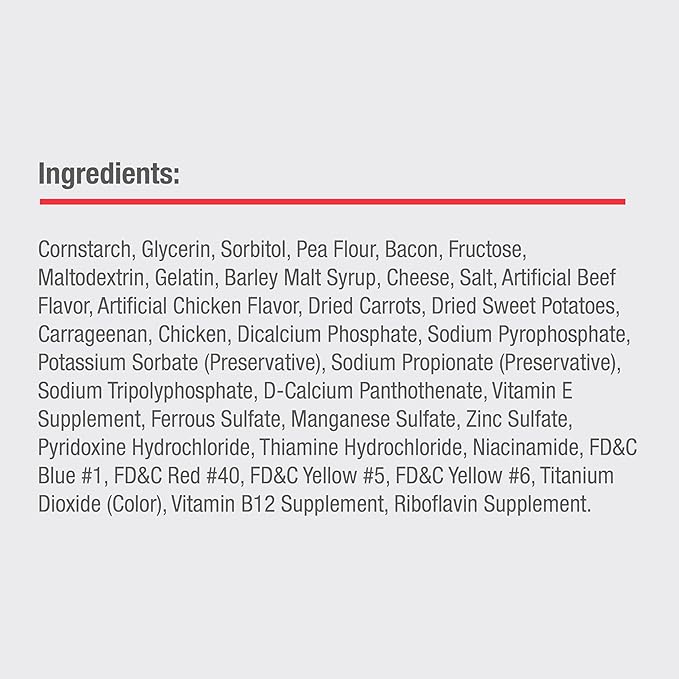 - MADE WITH REAL BACON & CHEESE FLAVOR: These 100% delicious chews are made with vegetables and real bacon and cheese flavor for a scrumptious taste dogs can’t resist.