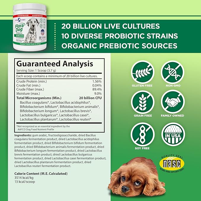 - Premium Probiotic for Dogs - Flora Dog is a high quality, high potency daily probiotic formula with 20 Billion live cultures per serving from 10 clinically studied strains plus organic prebiotics to help feed the beneficial probiotics in your dog’s digestive tract. It provides multiple health benefits: promotes digestive balance and proper digestion, supports bowel and immune health including seasonal allergies, and supports the gut microbiome by replenishing beneficial microflora every day.