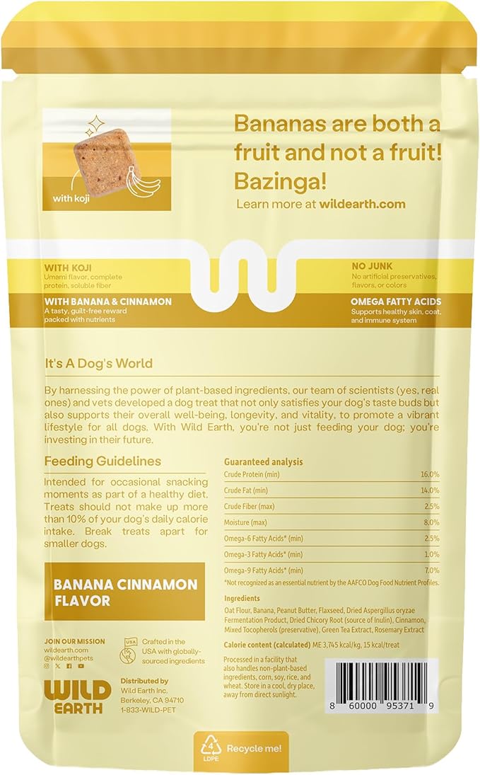 Wild Earth Superfood Dog Treats, Plant Based Dog Treats with Omega Acids, Prebiotics & Koji Protein, No Fillers, Veterinarian-Developed, Banana & Cinnamon Flavor