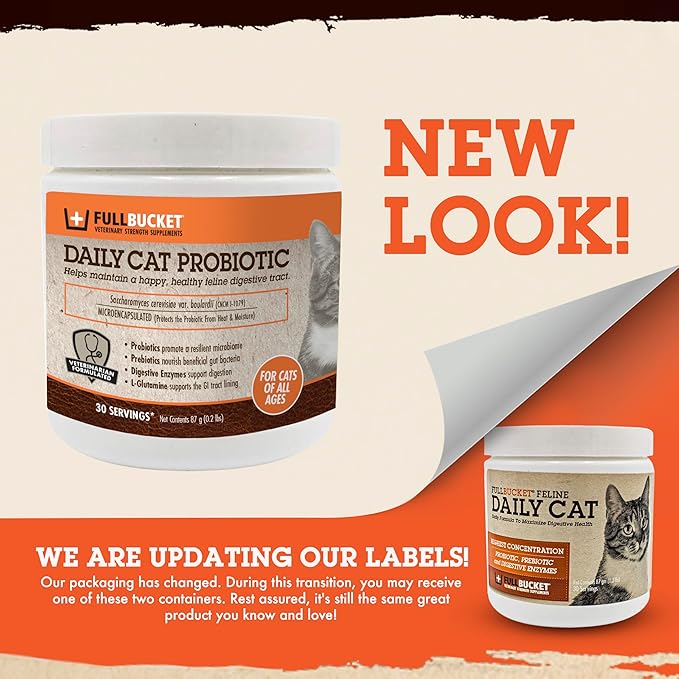FullBucket Daily Cat Probiotic Powder - Digestive Supplement for Diarrhea, Gas and Supporting Gut & Stomach Health with Prebiotics & Enzymes, 30 Servings