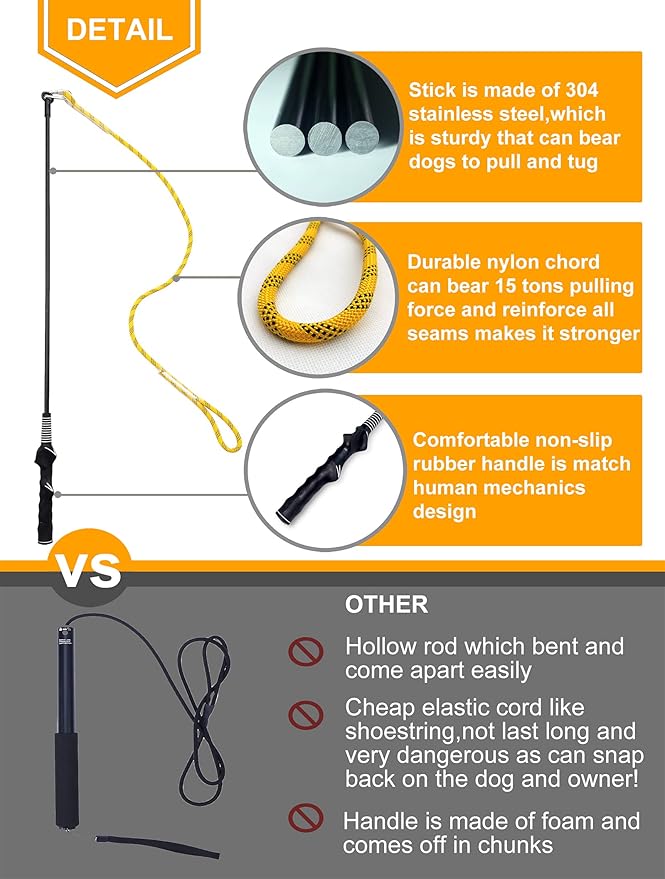 - Longer & Indestructible Pole:The 39.5” length of the rod is great for the dog to run a larger circle.And the solid fetch stick is made of 304 stainless steel composite fiberglass ,will not bend,which is sturdy that can bear heavy duty big dogs especially aggressive chewer to weight pulling and tugging.The non-slip rubber handle contours around your hand.Very comfortable to hold.