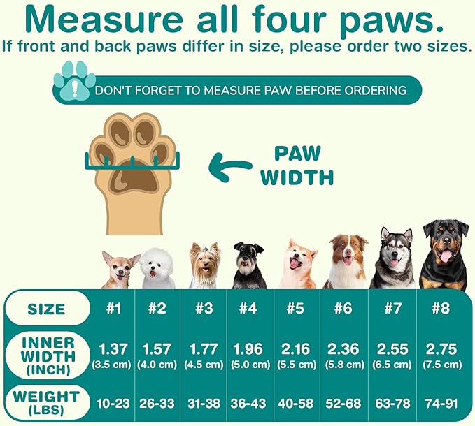 - Size selection: Please measure the width of your dog's four paws, it’s crucial. Different sizes may require two pairs.Weight is only a secondary reference. Size 1 width 1.37 inches for 10-23 lbs