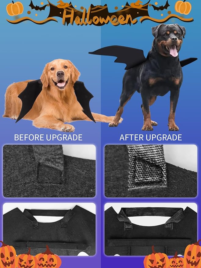 - NEW UPGRADE: This bat wing made of higher quality felt with a thickness of 5mm, which always keeps flying posture without sagging. The straps made of nylon material, which is tougher. Sewing area of contact point between straps and wings is increased to prevent falling off. A extra pull ring is added to back of the bat wings for attaching dog leash. Not a cheaply made.