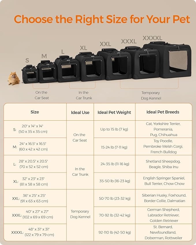 - 【CHOOSE THE RIGHT SIZE】This 48" x 31" x 31" collapsible dog carrier is ideal for pets between 92-110 lb. Please read our tips on the pictures to measure your pet and choose the right size