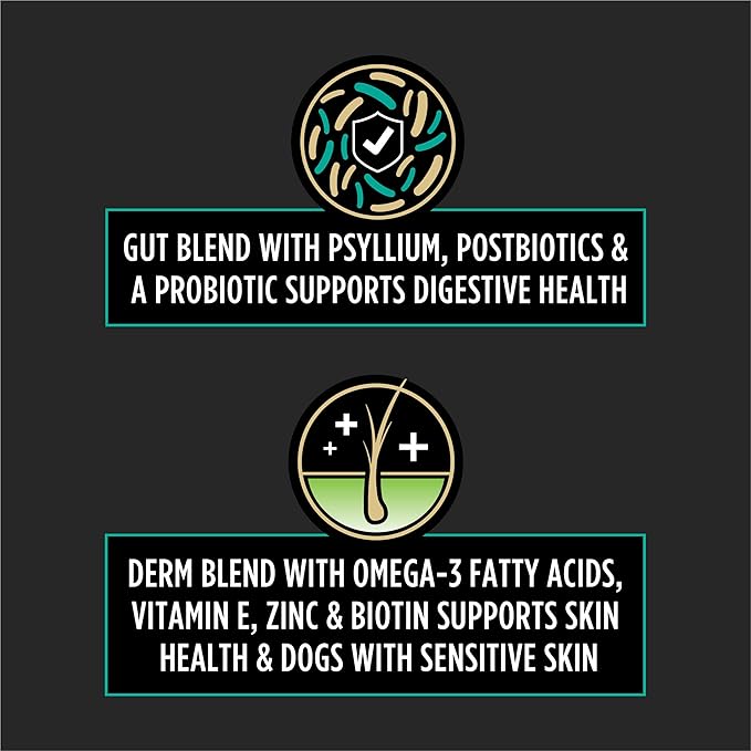 - Dog food supplements, made with a gut blend containing psyllium, postbiotics, and a probiotic to support digestive health