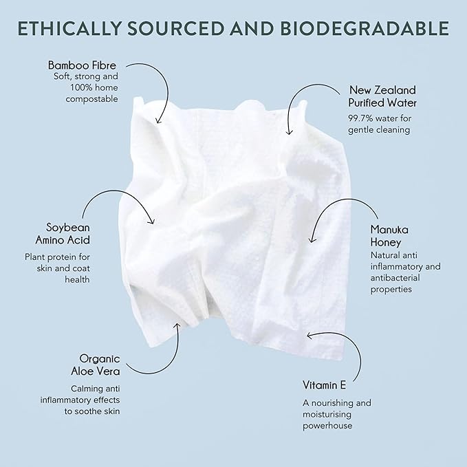 - ๐๐๐ง๐ญ๐ฅ๐ ๐๐ง๐ ๐ซ๐๐๐ข๐๐ง๐ญ๐ฌ - We use the following natural ingredients: New Zealand Purified Water for gentle cleaning, Manuka Honey for added care, Vitamin E for nourishment and moisturizing, Organic Aloe Vera to soothe, and Soybean Amino Acid as a plant protein for skin and coat health. The dog wipes are perfect for delicate, sensitive skin.