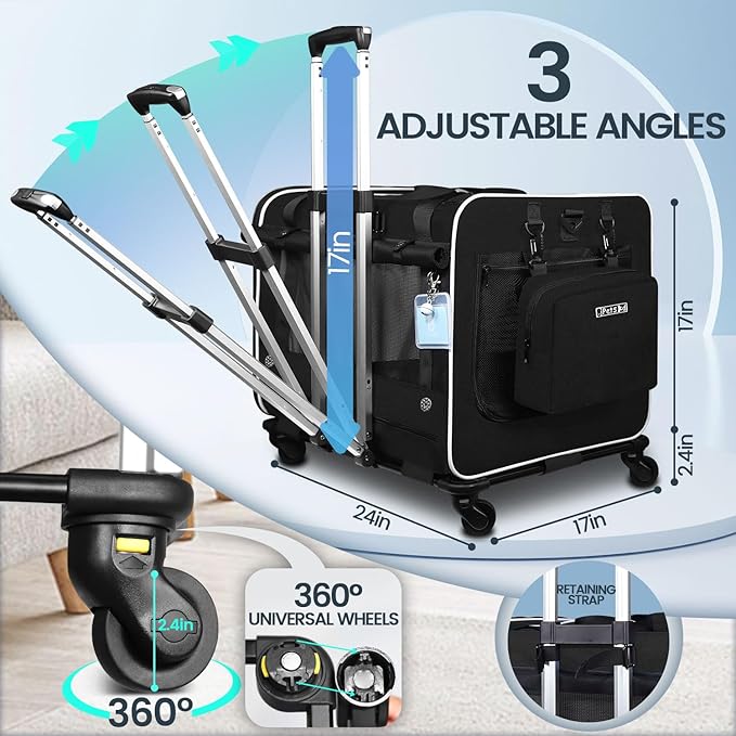 Petskd Extra Large Cat Carrier with Wheels and Litter Box, 24"x17"x17" Rolling Soft Carrier Until 55LBS Pets with 5 Breathable Mesh Windows and Locking Zippers for Long Distance Car Travel(Black)