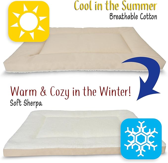 - ๐๐ญ๐ฒ๐ฅ๐ข๐ฌ๐ก ๐๐จ๐ฅ๐จ๐ซ๐ฌ & ๐ ๐๐๐ซ๐ข๐: Available in Plush fabrics, our Soft Crate Pads come in designer colors that will look great in your home. Choose from a Cream, Blue, or Pink Dog Bed that feels so luxurious youยดll want to sleep on it! Our Denim or Tan Dog Crate Mat is the Only (Truly) Cotton Dog Bed on Amazon. With a reversible Sherpa side for cold weather and Cotton for warm summers, this is the perfect all season Crate Pad!