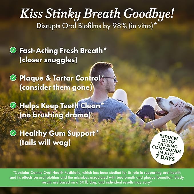 - Dog Fresh Breath & Oral Health Support - Doggie Dental by Other Half uses a Proprietary Fresh Breath & Oral Microbiome Support Blend (580 mg) with Chicory Root Fiber, Parsley, and Fennel Seed Powder to combat bad breath and promote a balanced oral microbiome. Banish stinky breath and keep your pup's microbiome howling with happiness!