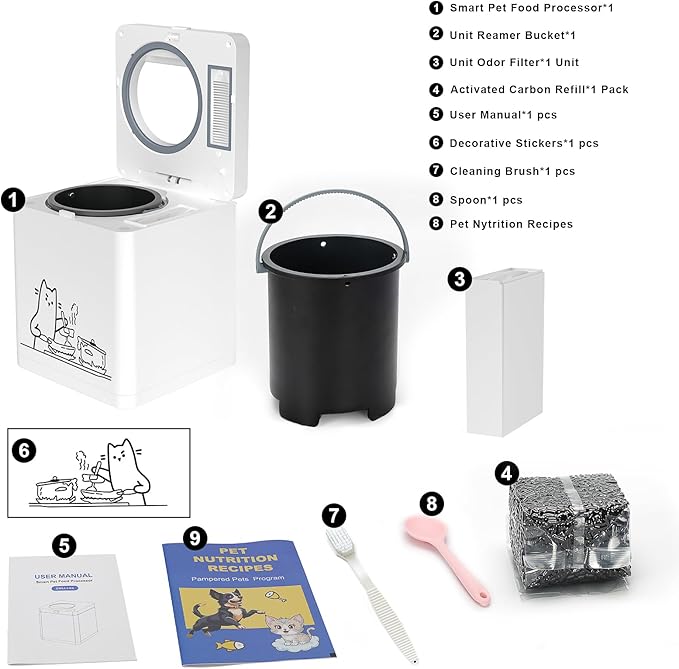 - Complete Accessory Set – Includes Pet Food Processor,Pet Menu, odor filter, cleaning brush, spoon, decorative stickers, and user manual. Create nutritious, homemade pet food with ease!