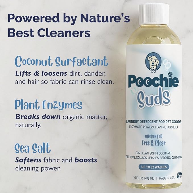 Poochie Suds Pet Laundry Detergent, Enzyme Cleaner and Odor Remover, Hypoallergenic and Fragrance-Free Pet Safe Detergent for Dog and Cat Bedding, Blankets, Toys and Gear, Made in USA, 16 fl oz