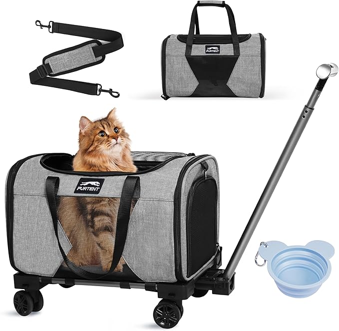 - 【MULTI-MODE CARRING FOR EFFORTLESS TRAVEL】This cat carrier includes a foldable trolley with detachable 360°swivel wheels for easy pulling and compact storage. The rolling cat carrier has a luggage strap to secure it to suitcases, and also comes with an adjustable shoulder strap for easy hand or shoulder carry. This backpack is suitable for various scenarios, including car, road trip, camping, plane or train. The included water bowl is for your pet to drink water.