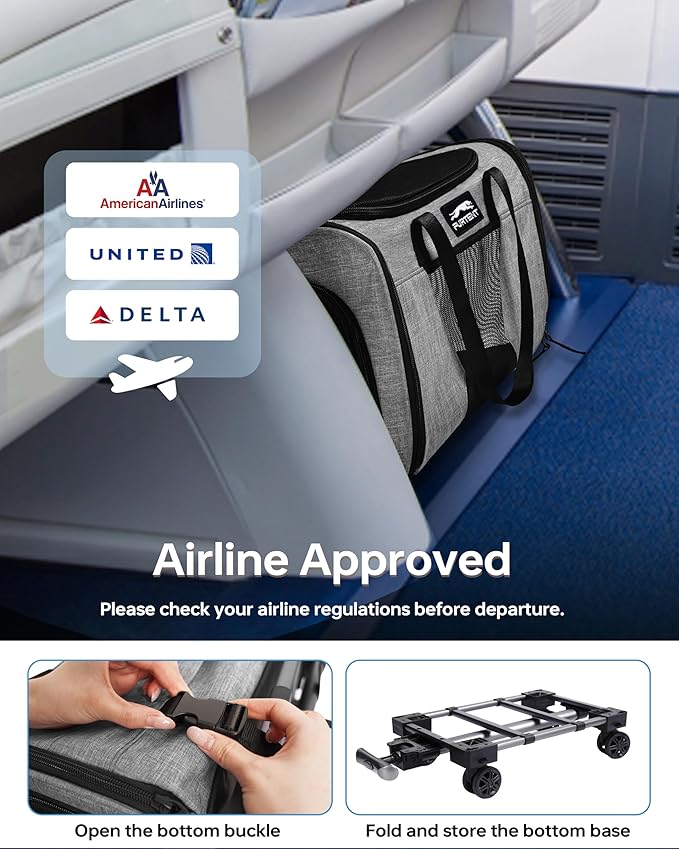 - 【AIRLINE-APPROVED】Certified by several airlines for in-cabin use (To ensure your flight is smooth, please check your airline’s pet policy before travel). Pet carrier size: 16.5in*11in*10.2in (without wheels). We recommend that the dog weight under 11lbs and cat weight under 13lbs. Please choose the carrier based on your pet's length and height, not just weight.