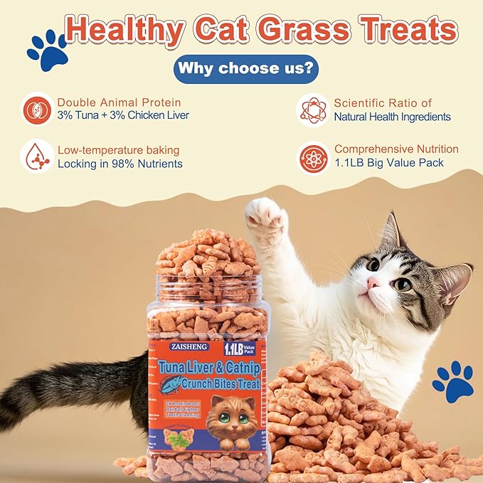 - Low-Calorie Training & Reward Grass Cat Treats: Shaped like little fish, these crunchy Cat grass with catnip biscuits are perfect for training, playtime, or rewarding good behavior. Each has only 1.3 calories, a light option for weight management without sacrificing taste or texture.