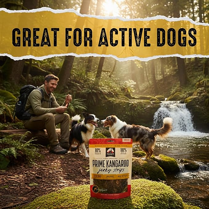 - HIGH PROTEIN & NUTRIENT RICH: Kangaroo meat is naturally lean yet rich in essential nutrients, providing high quality protein to help maintain energy and strong muscles. Each strip is air dried to lock in natural nutrition with a chewy texture dogs love.