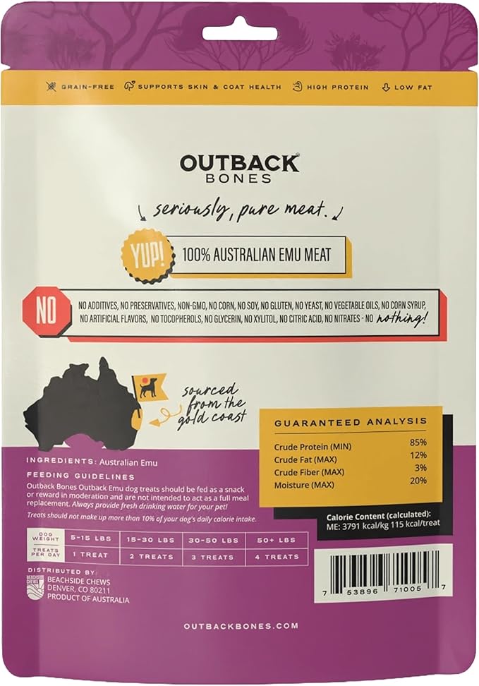 - SINGLE INGREDIENT DOG TREATS: Outback Emu Dog Treats Jerky Strips deliver premium nutrition in every bite, offering a unique and wholesome treat option for dogs | Made from 100% single-ingredient emu meat, these natural dog treats are an excellent choice for pet parents seeking high protein rewards.