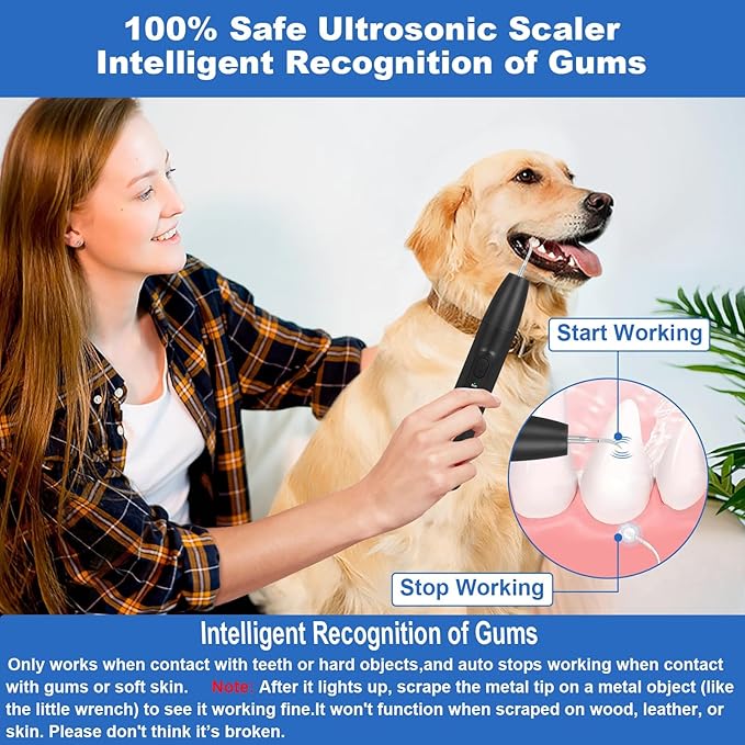 - 【Smart & Safe Design】Our dog teeth cleaning kit features intelligent recognition. The sonic dog plaque and tartar remover starts on contact with teeth and stops near gums. With low noise,the dog tooth brushing kit offers safe oral care, keeping your pet stress-free.